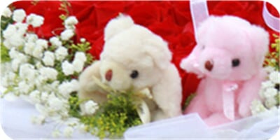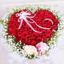 花 材99枝紅玫瑰,滿天星、黃鶯外圍,2個(gè)情侶小熊
