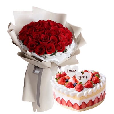 33枝紅玫瑰;心形水果蛋糕,草莓(時(shí)令水果為準(zhǔn))鋪面和底部圍邊