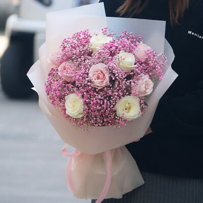 花 材4支白玫瑰,5支粉玫瑰,粉色滿天星間插豐滿