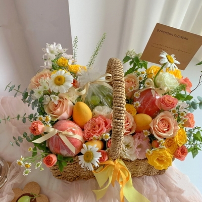 6枝粉雪山玫瑰,8枝黃玫瑰,提子1串,蘋果、芒果,多頭玫瑰、小雛菊、尤加利葉搭配