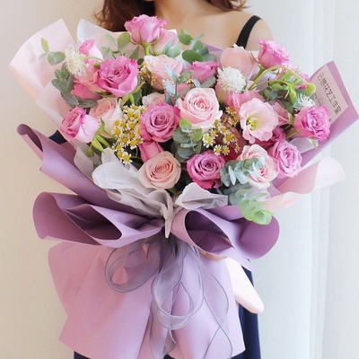 花 材33支混搭玫瑰(17支紫玫瑰+16支粉玫瑰),洋甘菊、尤加利葉搭配