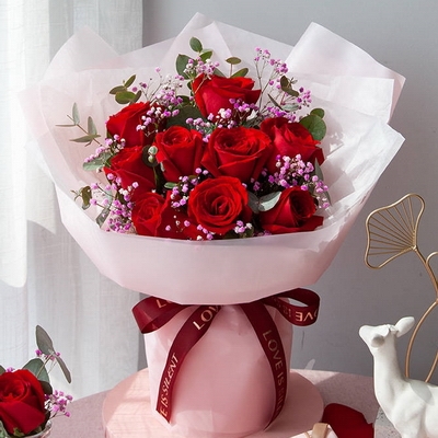 花 材11枝精品紅玫瑰,粉色滿天星,尤加利間插