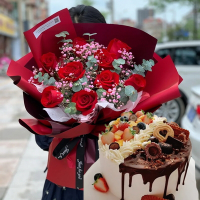 底部現(xiàn)烤蛋糕胚,中層新鮮水果夾心,表層時令水果,巧克力醬淋面,巧克力,餅干等裝飾;11朵紅玫瑰,粉色滿天星、尤加利葉間插