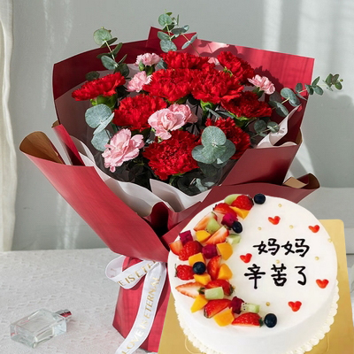 圓形水果蛋糕,奶油裱字“媽媽辛苦了”,新鮮時令水果裝飾;9支紅色康乃馨,粉色多丁,尤加利葉搭配