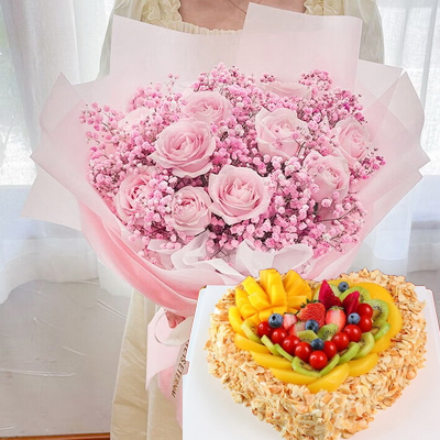 心形水果蛋糕;11支粉玫瑰